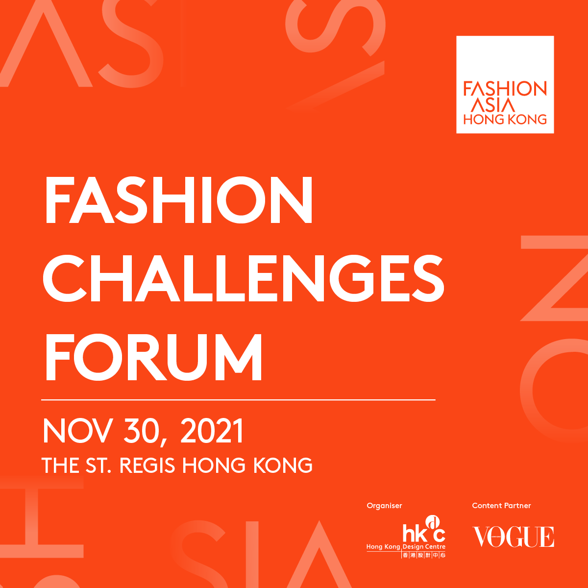 由 HKDC 香港設計中心 主辦的大型多元時尚企劃 Fashion Asia HK ,將於 11 月 30 日至 12 月 7 日為參與者帶來多項精彩節目。其中 11 月 30 日在 The St. Regis Hong Kong 舉行的 Fashion Challenges Forum (時尚未來論壇) ,透過匯集業界領袖、專家和設計師等交流對話,激發創意靈感,並深入探討時尚行業當前面對的重要議題。