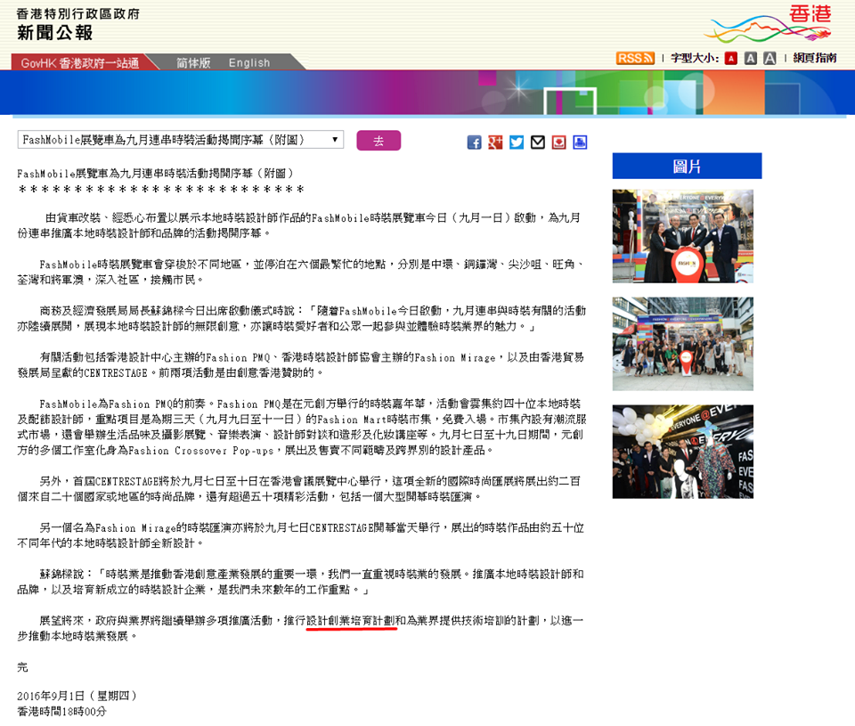 Source: 香港特別行政區政府 新聞公佈 | 2016.09.01 Subject: FashMobile展覽車為九月連串時裝活動揭開序幕